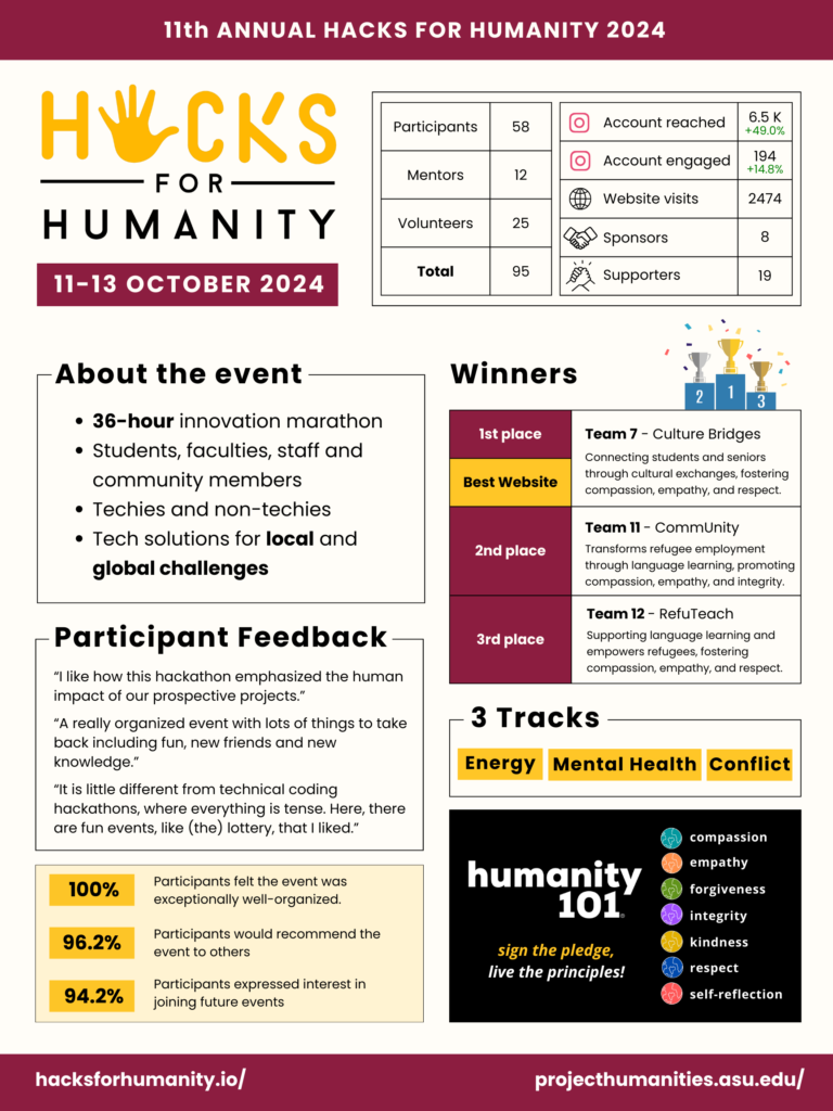 Hosted by Project Humanities at Arizona State University, Hacks for Humanity is not just a hackathon—it’s a 36-hour innovation marathon. Participants from diverse backgrounds—including students, faculty, staff, and community members—come together to develop technical solutions that address pressing local and global challenges. By integrating the seven core principles of Humanity 101®—compassion, empathy, forgiveness, integrity, kindness, respect, and self-reflection—each project not only proposes a solution but also fosters personal growth and community understanding.