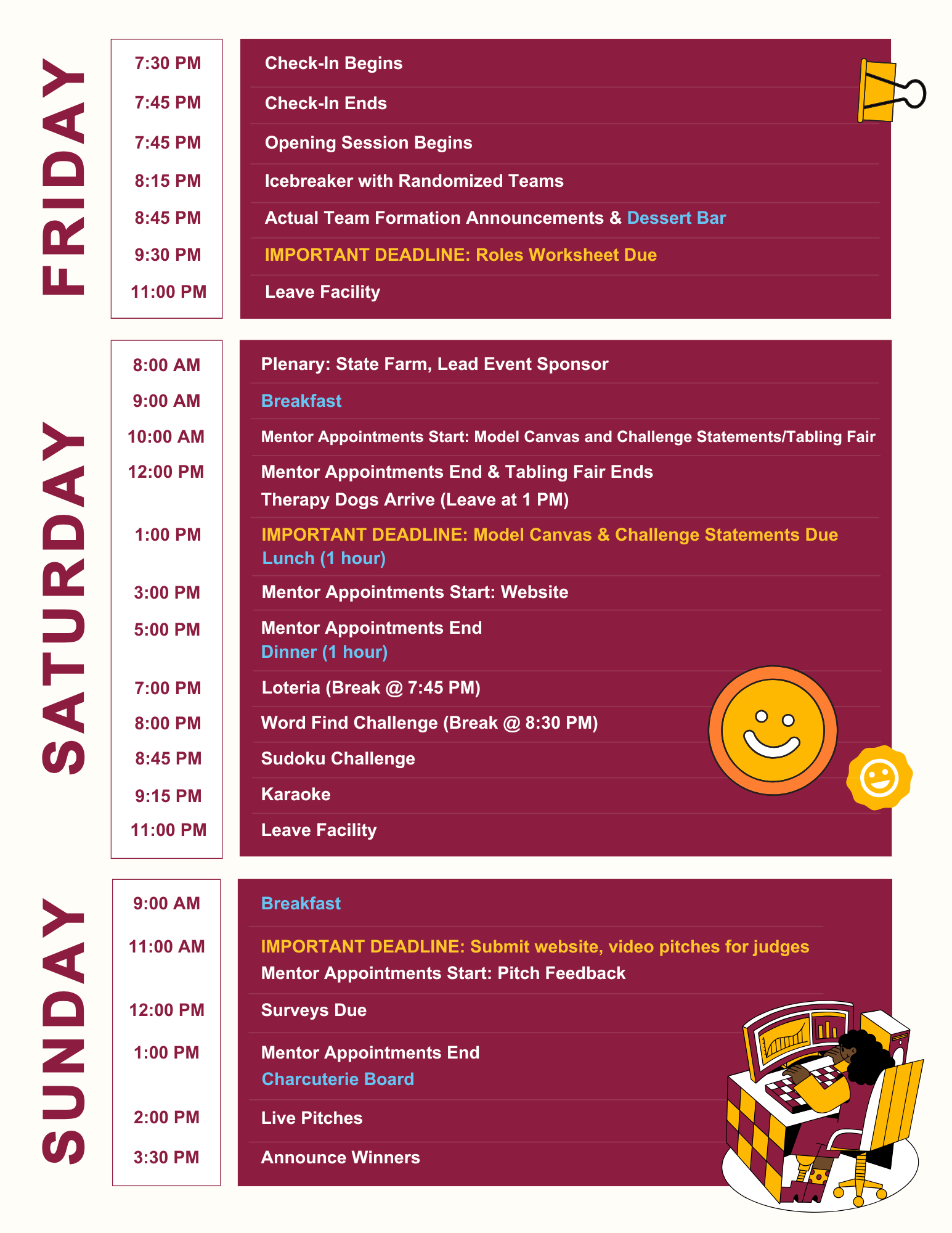 - Assist with tasks such as registrant sign ins, facilitate participant activities throughout 36-hour event